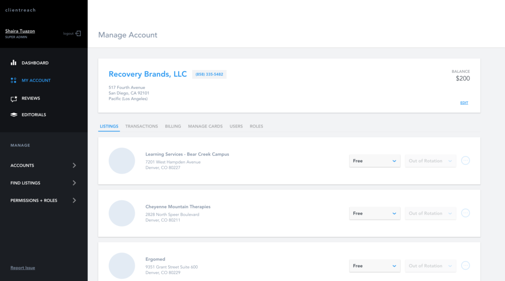 ClientReach is a cloud-based product that serves as an ad management platform. Our websites on addiction and mental health get millions of unique visitors each month and ClientReach connects addiction rehab centers to patients seeking treatment by providing ad placements. This dashboard allows users to view all listings, monitor analytics and make changes.